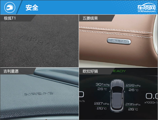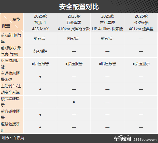 安全配置部分,极狐T1表现得最为完善。具体来看,除了基础的被动安全配置,其还搭载了不少主动安全配置,例如车道偏离预警系统、主动刹车/主动安全系统以及前方碰撞预警。五菱缤果的亮点是配备了疲劳驾驶提示,而欧拉好猫则是独享了胎压显示功能,相较另外三款车型配备的胎压监测要更加直观一些。