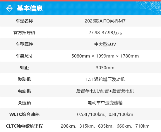 全新问界M7共推出12款车型,售价27.98-37.98万元。动力上提供纯电和增程双动力选择。与此同时,官方推出了限时60000元的购车权益,包括价值8000元选配金、价值8000元副驾准零重力座椅、价值12000元舒享包、价值20000元ADS高阶功能包补贴权益等(详情请咨询当地经销商)。