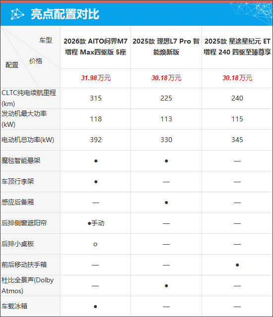 具体到车辆配置层面,以增程版车型对比来看,AITO问界M7展现出压倒性优势。其不仅在纯电续航与动力参数上领先,更独享多项提升体验的实用配置,如车顶行李架、手动后排侧窗遮阳帘以及车载冰箱,并可选装后排小桌板。相较之下,理想L7的感应后备厢、杜比全景声与星途星纪元 ET的前后移动扶手箱等独有配置,其吸引力与实用性均难以与AITO问界M7相提并论,尤其对于家庭用户而言。