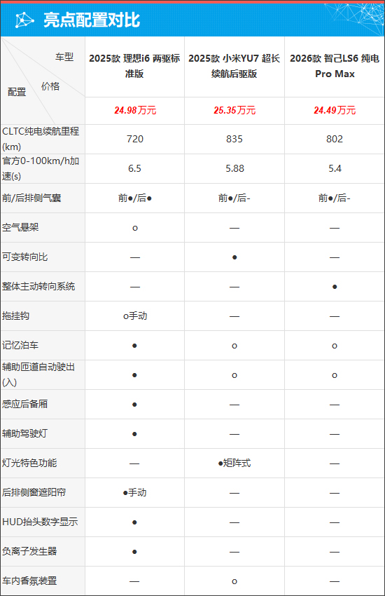 具体到车辆配置层面,通过对比来看,理想i6显然更加丰富一些。其独享后排侧气囊、感应后备厢、辅助驾驶灯、手动后排侧窗遮阳帘、HUD抬头数字显示以及负离子发生器,并且提供空气悬架和手动拖挂钩功能的选装,用车体验十分出色。相比之下,小米YU7独享可变转向比和矩阵式大灯,智己LS6独享整体主动转向系统,二者的亮点配置均较理想i6逊色一些。