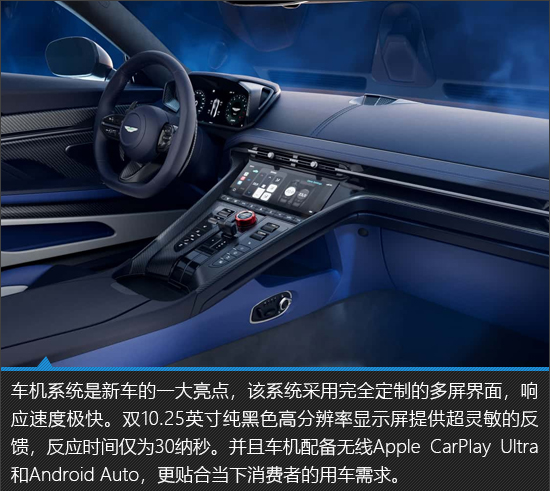 阿斯顿·马丁DB12 S的内饰延续了品牌一贯的英伦格调,整体布局简洁而克制,却在细节中尽显匠心。中控台线条流畅,材质选用极为考究,彰显出纯正的豪华气韵。同时,新车融入了前沿的智能科技配置,在传统与现代之间实现了平衡,将奢华与科技完美融合。