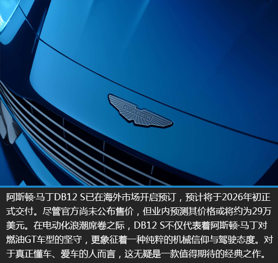 阿斯顿·马丁DB12 S,在优雅的外壳下隐藏着狂野之心。它用流动的线条诠释空气动力学的极致,用手工与科技描绘英伦美学的边界。在浮躁的世界里,阿斯顿·马丁DB12 S像一杯陈年威士忌——醇厚、深邃、且令人回味无穷。