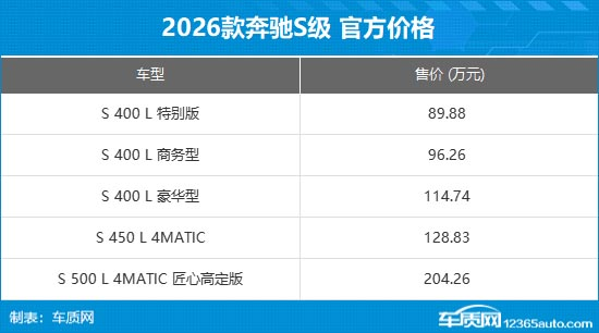10月28日,2026款奔驰S级正式上市,新车共推出5款车型,售价区间为89.88-204.26万元。作为年度改款车型,新车新推出了S 400 L特别版车型,成为新的入门版车型,进一步降低了购车门槛。