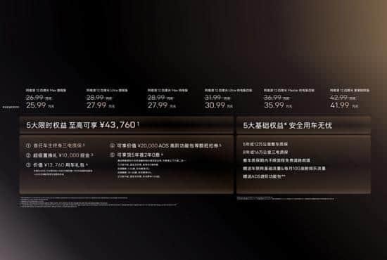 动力方面,依旧提供增程和纯电两种动力形式。增程版车型搭载1.5T涡轮增压发动机和单电机,电动机总功率231kW,CLTC纯电续航里程为356km;纯电版车型有单电机和双电机可选,电动机总功率分别为237kW、402kW,根据配置不同,CLTC纯电续航里程分别为755km和705km。