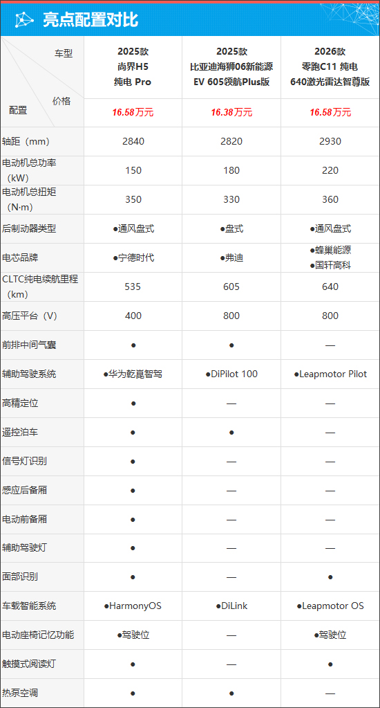 根据售价区间来看,2025款比亚迪海狮06新能源的入门车型价格最低,2025款尚界H5不仅入手门槛最高,而且顶配版车型的价格也最贵,2026款零跑C11基本介于两者之间。车型数量方面,2025款尚界H5和2025款比亚迪海狮06新能源均有6款车型,2026款零跑C11共有5款。