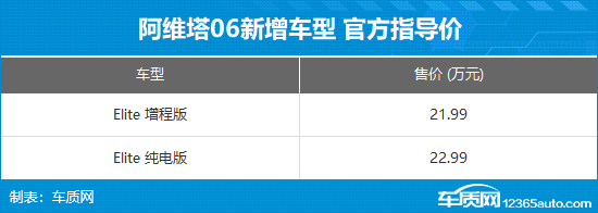 2025年11月3日,阿维塔06 Elite版正式上市,提供增程和纯电两种动力,官方指导价区间21.99-22.99万元,限时权益价20.49-21.49万元。Elite版定位介于Pro版和Max版之间,将搭载华为192线激光雷达、华为乾崑ADS 4与鸿蒙座舱HarmonySpace 5。