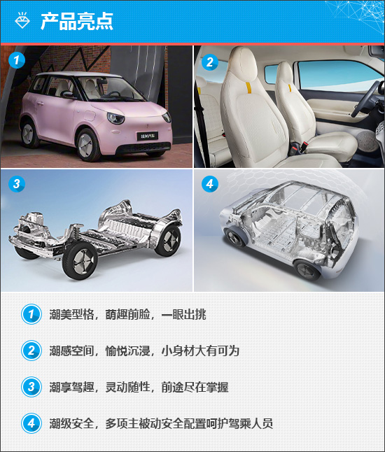 内饰提供茉莉白、薄荷绿、西柚三种配色可选,中控台布局简约规整,中高配车型搭载10.25英寸中控屏,部分车型还支持语音控制及HUAWEI HiCar手机互联。此外,新车采用双门4座布局,前排座椅间为贯穿式中央通道设计,后排支持一键进入。后备厢常规容积为106L,后排座椅放倒后可扩展至882L。同时,其还提供17处随手储物空间,实用性表现出色。
