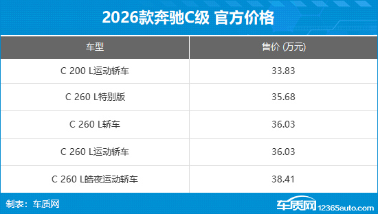 11月14日,2026款奔驰C级正式上市,新车推出5款车型,售价区间为33.83-38.41万元。作为中期改款车型,新车在动力总成和配置水平上进行重点升级,全系均换搭2.0T发动机。