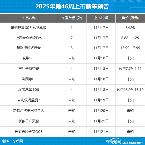 2025年第46周(11月17日-11月23日)上市新车预告