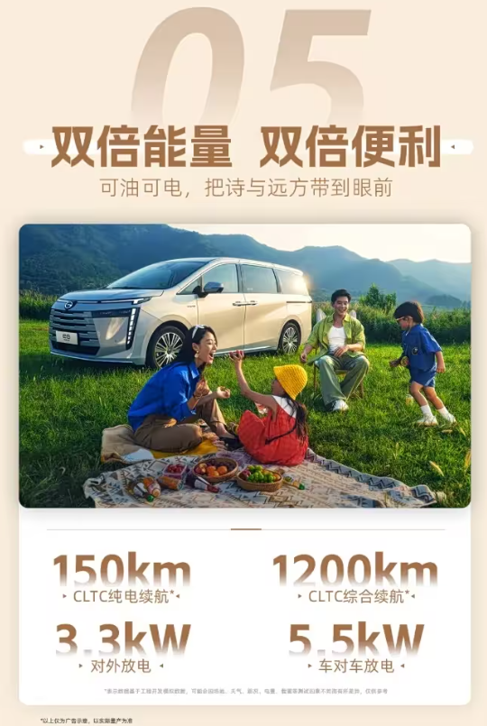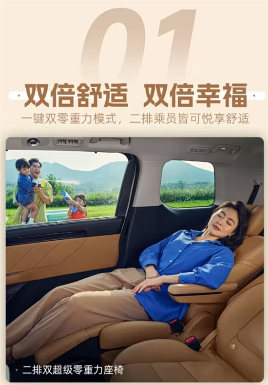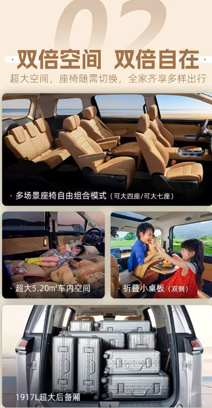 新车外观设计与现款车型保持相同,其长宽高达4920mm*1900mm*1760mm,轴距2930mm。二排双超级零重力座椅支持一键双零重力模式,搭配双侧折叠小桌板,让乘员全程悦享舒适;座椅可灵活切换大四座或大七座布局,配合1917L超大后备厢,满足全家多样出行需求。