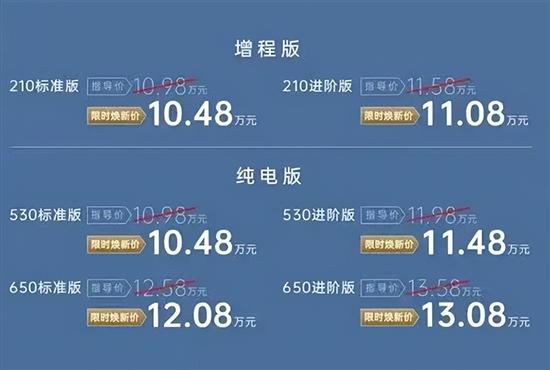 动力方面,新车提供增程式和纯电动两种选择。增程车型搭载1.5L自然吸气发动机和单电机,电动机总功率180kW,CLTC纯电续航里程210km;纯电车型搭载单电机,电动机总功率分别为150kW、165kW,CLTC纯电续航里程分别为530km、650km。
