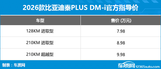 1月8日,2026款比亚迪秦PLUS DM-i正式上市,新车共推出3款配置,官方指导价为7.98-9.98万元。作为年度改款车型,新车重点针对动力与续航进行了升级,提供CLTC纯电续航128km和210km两种版本可选。