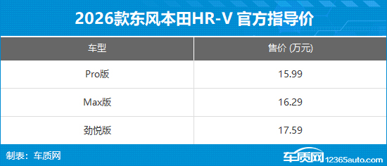 2026年1月8日,东风本田官方宣布,2026款本田HR-V正式上市,共推出3款车型,官方指导价15.99-17.59万元,现时售价10.99-12.59万元。新车主要针对配置进行了调整,外观内饰设计以及动力系统均与老款车型保持一致。