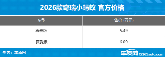 车质网从官方获悉,2026款奇瑞小蚂蚁正式迎来上市,新车推出喜爱版、真爱版两款配置,市场指导价区间为5.49-6.09万元,叠加优惠后限时增购价5.19-5.79万元,置换双补价4.65-5.16万元,报废双补价低至4.26-4.72万元,性价比优势显著。