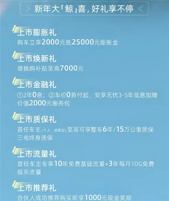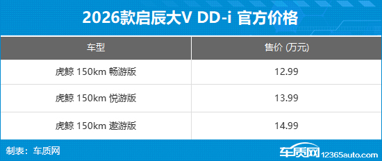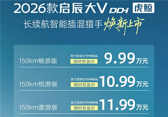 1月13日,2026款启辰大VDD-i虎鲸正式上市,新车推出3款车型,官方指导价12.99-14.99万元,同步上线限时权益价9.99-11.99万元。此次上市推出多重礼遇:2000元抵25000元膨胀金、至高7000元增换购补贴、12年0息或低息金融方案,首任车主可享整车6年/15万公里质保、三电终身质保,以及10年免费基础流量+3年每月10G娱乐流量,合伙人推荐购车还能获1000元现金奖励。