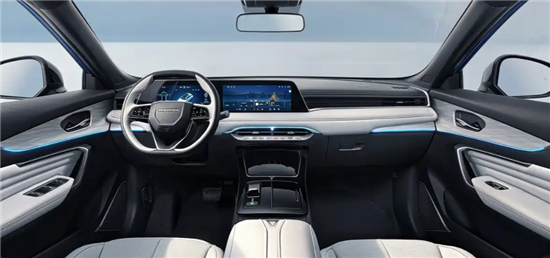 内饰配备一体式联屏屏与双色多功能方向盘,中控台通道区域采用拨杆式电子换挡机构。