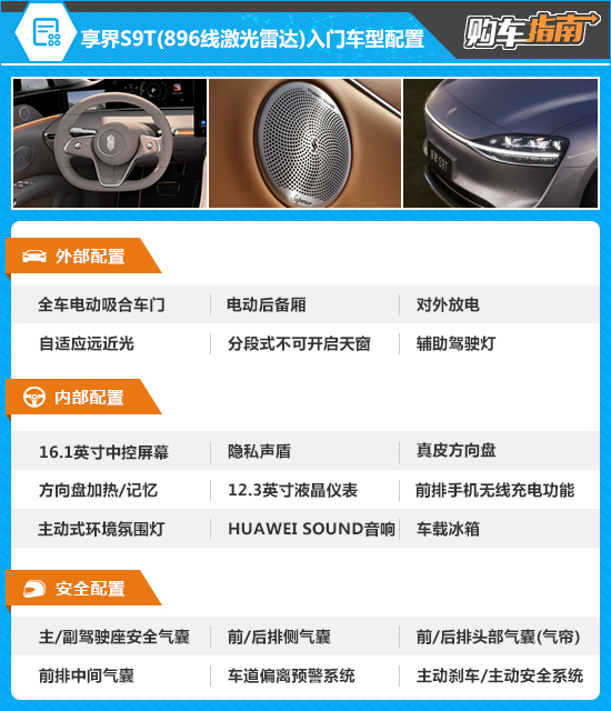 享界S9T(896线激光雷达)的入门车型配置表现出色,拥有大量实用性与舒适性功能,配合HUAWEI ADS辅助驾驶系统,不仅能够满足日常用车需求,在智能化体验上也达到了主流水平。而之所以此次不推荐,主要是还有性价比更高的车型。