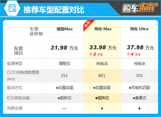 根据配置对比不难发现,增程Max与推荐车型相比,配置基本一致,主要区别集中在动力系统。推荐车型配备了纯电动力,并且CLTC纯电续航里程可达801km,满足日常用车需求绰绰有余,大部分用户都能够实现一周充一次电,再结合较低的用车成本,如果高速场景不多,那么比增程版车型性价比更高。