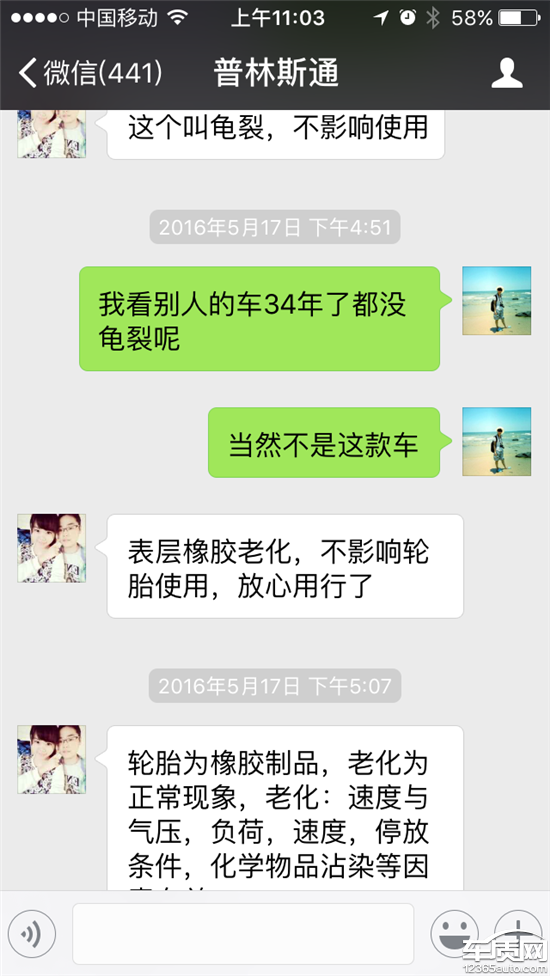 大概2015年9月发现该问题,但是当时没太在意,后来似乎又严重了,过完年给普林斯通投诉过,4S店登记了也没下文,处理结果就如上图轮胎售后说是正常的!正常个毛啊!轮胎的质量是保3年吧,才一年就老化了?这可是关系到生命安全啊,忍无可忍才投诉的,希望得到解决。