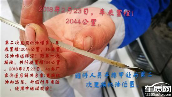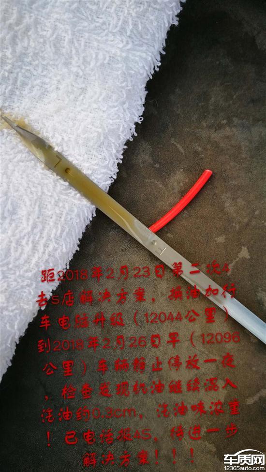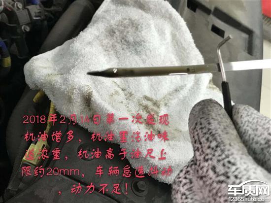 2018年2月14日上午城区驾驶,发现车辆动力不足,怠速抖动,车辆里程表显数11880KM,距上次保养更换机油(约10100KM左右,此间车辆共计行驶1700多公里,全部城区驾驶)停车冷却后自检,发现机油尺高于上限约20mm,机油增多,且机油里有很浓烈的汽油味道。电话报4S店售后,被告知进店检查。2018年2月14日,下午15点左右进店检查,4S店技术人员确认机油液面增高约20mm左右,且伴有很浓烈的汽油味道。检修后联系厂家技术人员,告知更换机油和机油滤芯后使用观察。2018年2月22日(车里程12044KM)行驶里程164KM,城区驾驶,发现机油继续增多且伴有汽油味,电话告知4S店售后人员。23日到店4S技术人员检查确认,继续更换机油和滤芯并升级行车电脑,使用观察。2018年2月26日,车表里程12096KM,期间行驶52公里,发现机油继续增多混入汽油,电话报4S店。4S告知车辆慎用,车位停放至今日(2018年3月1日)无解决方案!