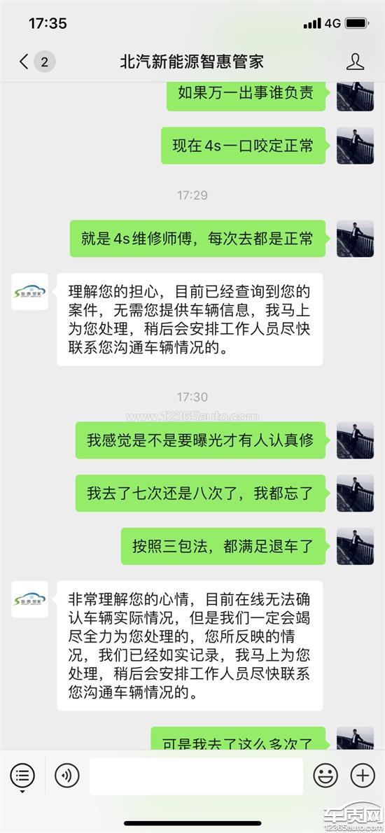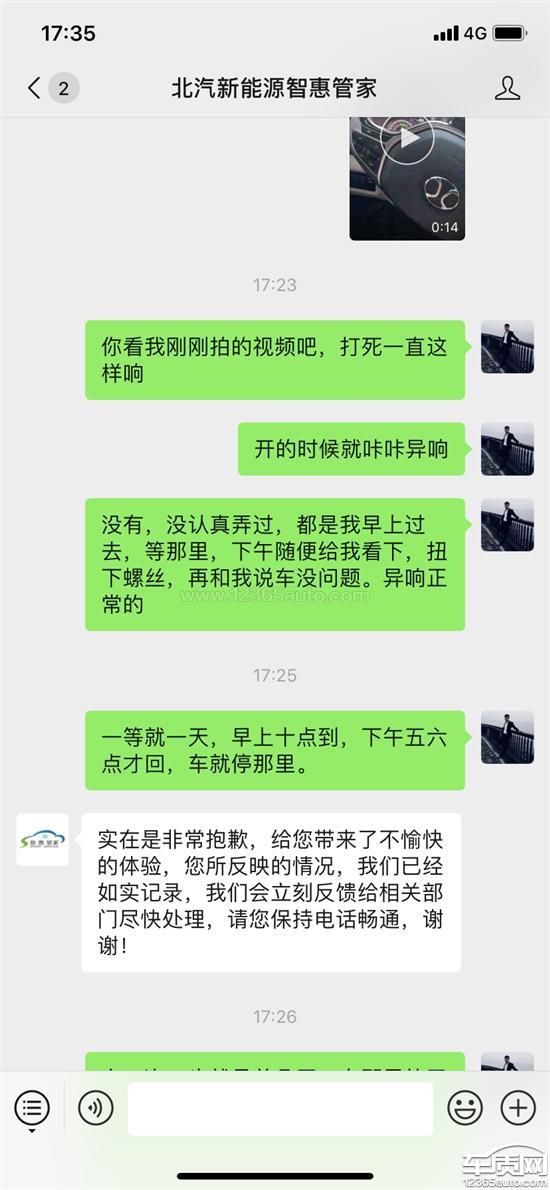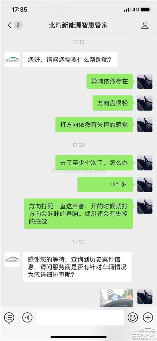 方向盘异响,打方向会有失控的感觉,去4S点不下七次,每次早上十点到,下午五六点给车,中途就是车放那里,快到时间了扭几颗螺丝,就说异响正常的,车弄好了。每次去都是这样。最后一次去,车放了两天,车根本都没修,过去拿回车来还是一样的故障。一样异响。厂家公众号反应,回复跟机器人一样复制粘贴。严重耽误别人时间,去了最少有七次了!最后一次车还放了两天,以上聊天是今天和厂家反应,厂家的态度,这种反应也不下于五次了!