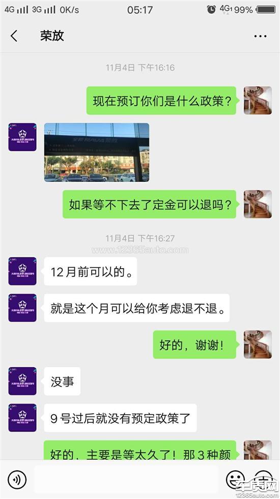 我于2019年11月4日微信咨询(2020新款RAV4荣放)(仙游分公司)销售(林曦鋆):现在是什么预订政策?如果等不及了可以退定金吗?他说12月前是可以退定金的,这个月就是给你考虑退不退的,过了11月9号就没有这个预订政策了,于是我11月8号就预订了这款车,提车日期是12月底至1月10号前,现因家中有事要回老家(河南)春节前就回不来了,这车也就是说等不及了,于是我11月25号去找他们退定金,拿出微信记录给他们看,理论之后不给退,销售如此欺骗客户,我把微信聊天记录截图给大家看一下,希望相关部门帮助协调解决一下!谢谢!