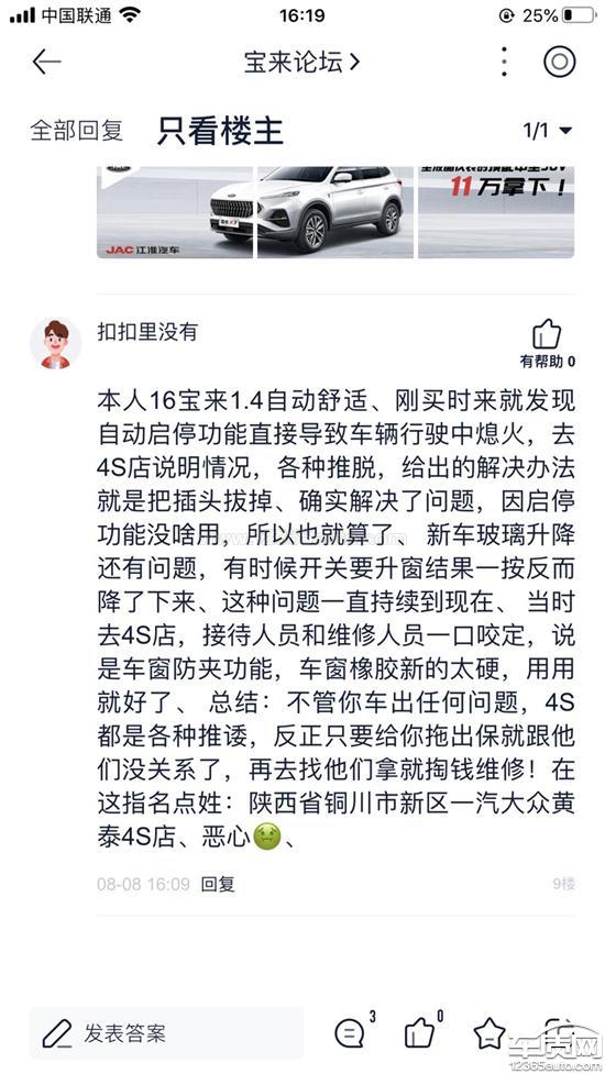 本人16宝来1.4自动舒适、刚买时来就发现自动启停功能直接导致车辆行驶中熄火,去4S店说明情况,各种推脱,给岀的解决办法就是把插头拔掉、确实解决了问题,因启停功能没啥用,所以也就算了、新车玻璃升降还有问题,有时候开关要升窗结果一按反而降了下来、这种问题一直持续到现在、当时去4S店,接待人员和维修人员一口咬定,说车窗防夹功能,车窗橡胶新的太硬,用用就好了、总结:不管你车出任何问题,4S都是各种推诿,反正只要给你拖出保就跟他门没关系了,再去找他们拿就掏钱维修!在这指名点姓:陕西省铜川市新区一汽大众黄泰4S店、恶心.