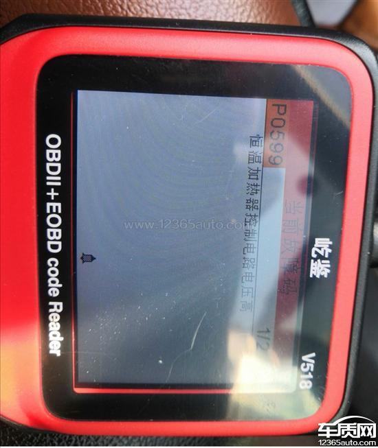 正常行驶过程中发动机故障灯亮,经故障诊断仪检查报P0599代码,恒温加热器控制电路电压高,经查询这个故障是这款车型通病还有水壶漏水问题,要求生产厂家给予免费维修。