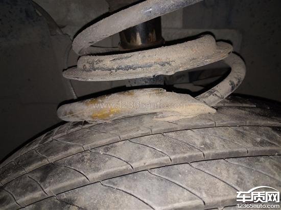 行驶间车辆异响,检查发现右前侧减震器上的弹簧断裂摩擦轮胎。变速箱下方有油渍。