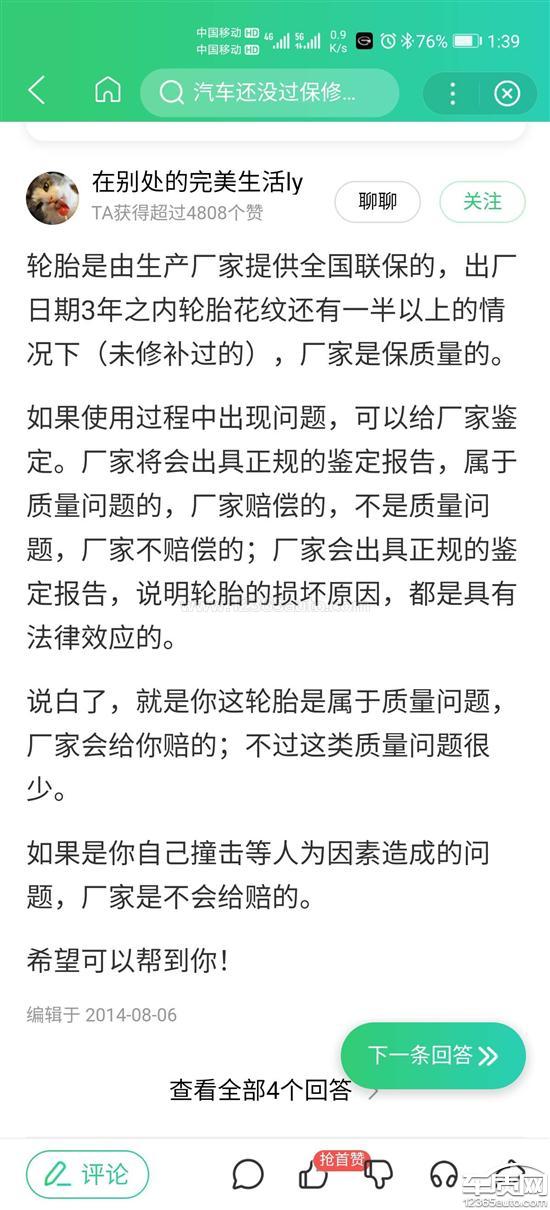 60KM/H行驶时两后轮胎有异响,车速越快响声越大,4S店检查后,说车辆的轮胎吃胎,要求先换轮胎再检查轴承是否有问题。