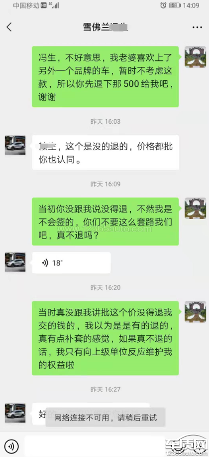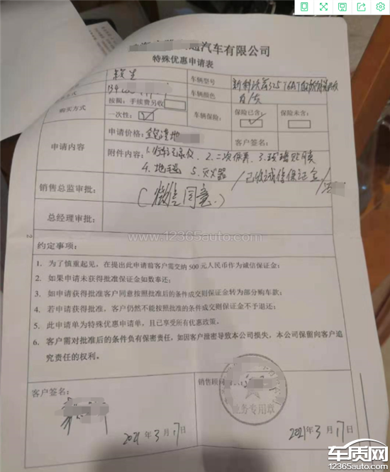 本人于2021年03月16日与业务员冯先生约好2021年03月17日下午16:00左右到该公司洽谈购买雪佛兰科沃兹小型自动挡轿车相关事宜。当天(2021年03月17日下午16:00左右)本人特意请了半天假到达4S店,后先行与冯先生了解了下此车的相关配套,颜色及各种参数,对该车型有了一个大概的了解。然后与该业务员商定了一个心目中的大概价格。但该业务员说他自己现无法作主,需要请示上级领导。在请示前对本人说为了表示诚意,需要我签一份《特殊优惠申请表》申请表并要求交纳500元作为诚意金。该业务员表示要填写此表后才能去申请,填写时没有过多的跟我讲此表的相关细则及一些重大利害关系的内容再加上我也赶时间回去没有多想就签字啦。签完后一会时间,该业务员就说上级领导已经同意了我的价格申请,如果无其它问题就可以签订正式的购买合同。我说我需要跟老婆商量下,待确认无误后再过来签订合同。于是第二天回去跟老婆商量了这件事,老婆说她更喜欢另外一个品牌的车型,暂时不想购买此车。因此,过了2天后我就向该汽车公司业务员说明了相关不购买此车的事宜,希望能将交的500元诚意金退回,但沟通多车次后,该汽车公司业务员以上级领导已批复和已签《特殊优惠申请表》为理由不给予退还。本人认为此《特殊优惠申请表》只是一个申请表,并非正式的销售购买合同,并且该申请表也未在重要位置和明显位置重点标示其利害关系,销售人员也未进行详细的利害关系说明而拒绝退回诚意金。根据《中华人民共和国消费者权益保护法》第九条和第二十六条的规定,已明显且严重地侵害了消费者的权利。同时,本人认为这种行为,应该不是个例,相信有很多消费者遭遇过跟我一个的经历,而且应该已成为公司的一个“套路”。这种行为必须给予制止,以还消费者一个公道。在此,要求退回客户的诚意金。