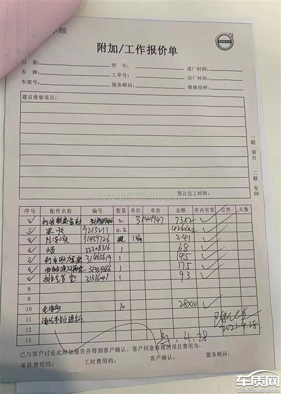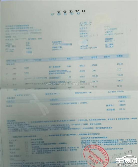 2020年开始出现没跑到1年或1万公里的保养间隔就提示要加机油1L,第一次出现是保养后8000公里左右提示,第二、三次出现均是保养后7000公里左右。前几次出现问题,要么到4S店自费添加机油,要么添加自己买的机油来解决。最近这次出现问题太离谱了,距离上次保养才开了半年(小于4000公里),就提示要加机油1L(见图)。到宁波4S店检查,放出来的机油3.4L(见图),随即4S店向沃尔沃厂家索赔后答复本人:修理总费用人民币18500元,其中个人须承担人民币6500元(见图)。要求厂家免费修复。