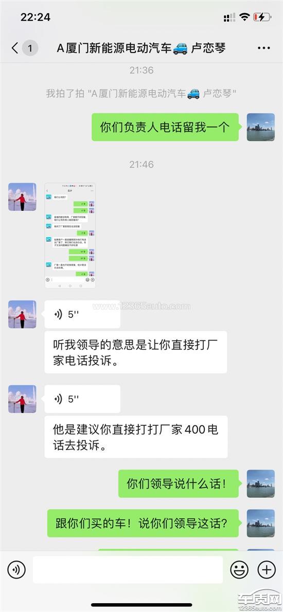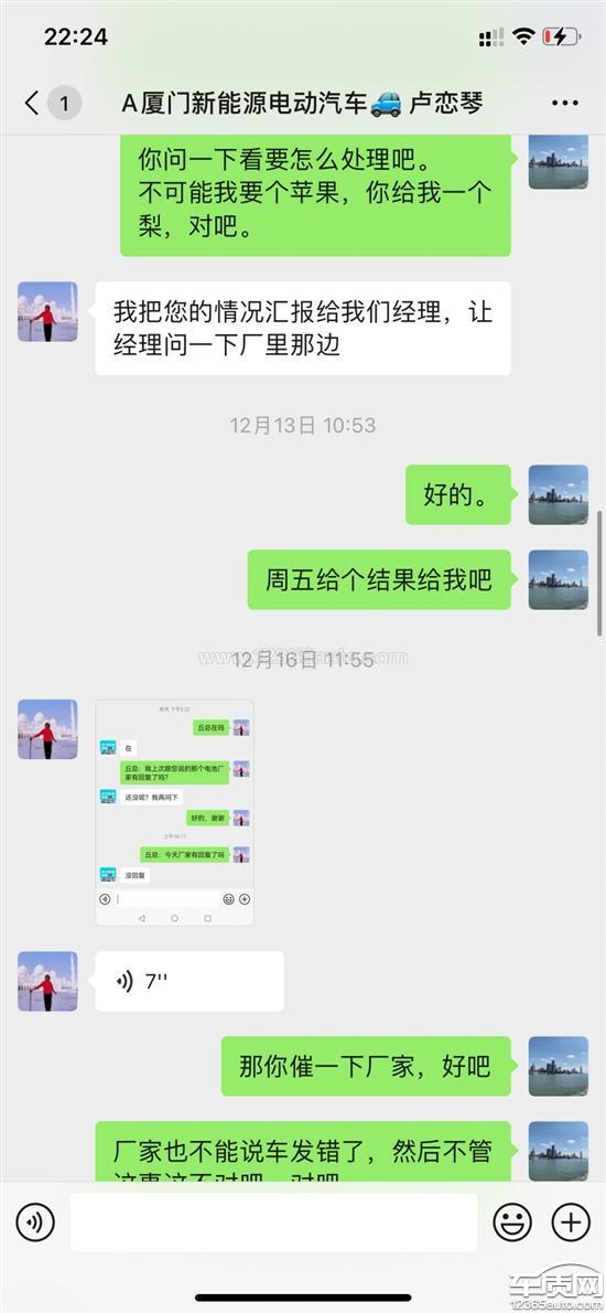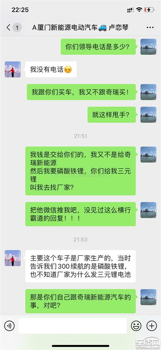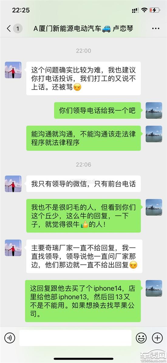 奇瑞新能源厂家回复:接到贵网反馈的客户信息后,我司非常重视:厦门鑫华兴汽车贸易有限公司反馈:会及时联系客户了解情况。具体车辆问题,会积极处理。我司会继续做好对该车的跟踪服务,为客户提供周到的售后服务和保障。同时也非常感谢客户对奇瑞汽车的关注和支持,衷心祝您生活愉快,工作顺利!