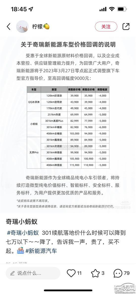 奇瑞新能源厂家回复:接到贵网反馈的客户信息后,我司非常重视:我司已经致电客户解释此次价格调整原因,努力争取客户谅解,我司会继续做好对该车的跟踪服务,为客户提供周到的售后服务和保障。同时也非常感谢客户对奇瑞汽车的关注和支持,衷心祝您生活愉快,工作顺利!