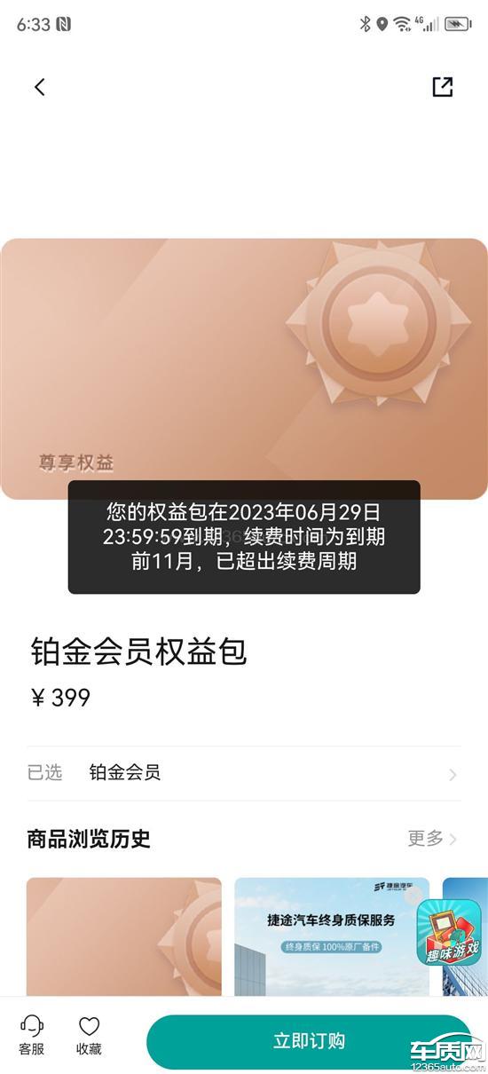 铂金会员无法续费,买车时厂家活动399赠送2次保养。每年提前2个月或者延后1个月可以续费,现还没到时间,无法续费,导致用户权益无法享受,无法得到保障。