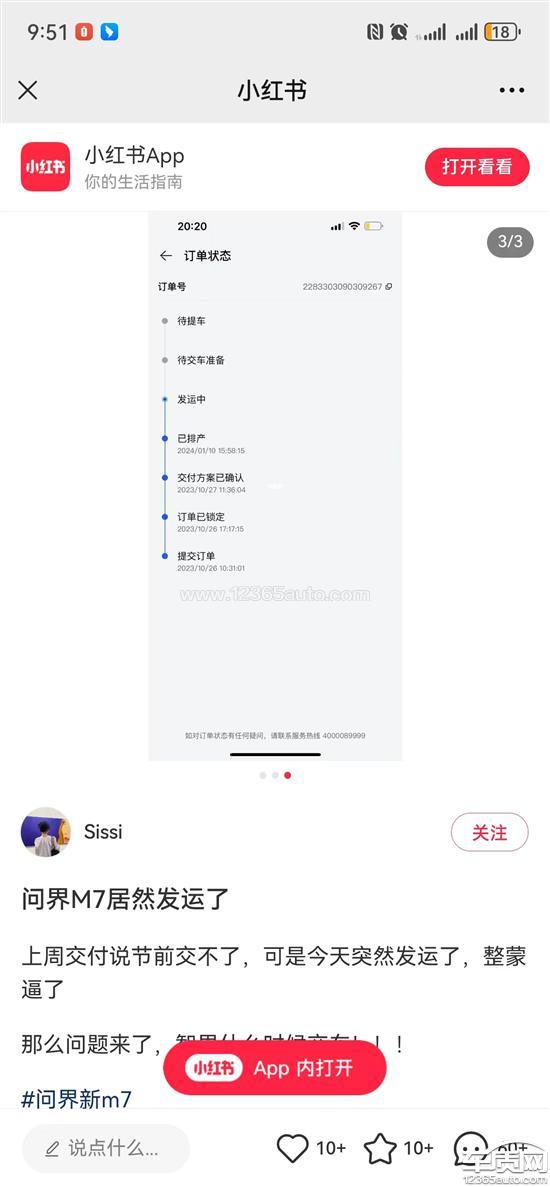 本人10月6日大定,官方10月8日确定的订单。此前说的是4~6周会交车,后销售拉群后改口,改为6~8周会交车。后直到12月底,AITO的APP显示本人车子将在1月6日前完成,但实际至今1月12日还没完成。官方此前宣传的是按照订单的下定顺序生产车子,但从网上看到别人的车子在10月27日确认的,同样的车型,已经发运了!!!见上传的图片1~3张,截图里订单号可查。为此在1月6日,本人诉求交付中心明确反馈进度,交付专员仅一句官方回复说公告表示年前会完成,再无其他话语,安抚的说话也不曾有。为此,本人再1月8日再投诉到AITO的400电话热线,400客服表示72小时内将会回复,截止昨天已超72小时,昨天本人再次致电400电话热线,仍然没有相关回复。购车协议中仅对客户进行了相关的约束条款,但对于官方交车拖延的条款约束并没有,属霸王条款!!!实属店大欺客