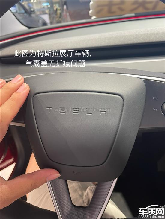 气囊盖表面存在明显外观缺陷,有一条明显的折痕,由于方向盘是每天使用的部件,缺陷显眼且在视线集中位置,无法忍受,车辆在三包期,我多次向特斯拉公司投诉反馈,要求更换气囊盖总成,但对方一直以不是质量缺陷为由,拒绝更换,我到特斯拉展厅对比过其他model 3实车,展车并不存在外观质量缺陷,因此我要求更换无缺陷的气囊盖总成。