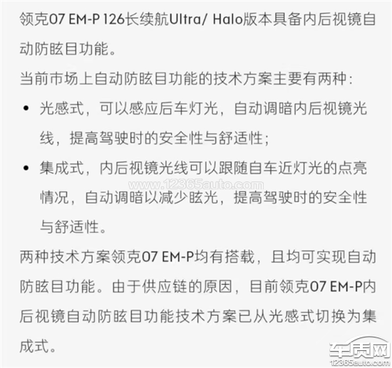 购车前官方说领克07高配版是带后视镜防眩目的,但实际上晚上行驶发现自动防眩光后视镜很暗,检查发现是后视镜上没有光线传感器,另外发现车辆在P挡,R挡位模式下自动关闭防眩目功能,此外已经车主拔掉线束后发现车辆只有两根线,(领克08同样带有防眩目功能,接插件为3pin线束),现在严重影响车主晚上行车驾驶安全,晚上后视镜无法看清后面车辆,安全问题请尽快解决。官方说法是修改了生产线,但是并未提前告知,用户手册也是光感自动感应,官方自己说明都打自己脸。官方宣传自动防眩光,现在只能手动关闭,打开,做不到所谓的自动防眩光功能。