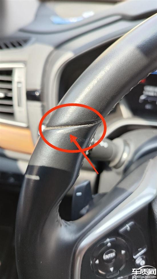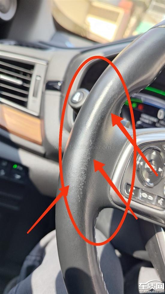 如图所示,方向盘箭头标示处,已经开始掉皮痕迹。在此之前,我在网上论坛和微信车友群上,已经有车友反映这个问题,真皮不真,竟然那么快出现掉皮,有的2年车龄也出现这个问题,厂家也同意免费更换方向盘。我注意到这个情况,担心我的车方向盘担心出这样的问题,还有其他混动车其他问题,就购买了2年延保。与此同时,也经常保养打理,用抹布抹等方法,尽可能保持方向盘干净。结果还是出现掉皮现象。上两个星期天去就近的东风本田4S店,通过拍照后,经过厂家确认,说是正常磨损,我不服,打厂家电话,结果4S店再次要求回店重新拍照,现在结果还是说正常磨损。(附:前档玻璃车顶位置出脱胶起泡,第一次说是正常不影响,第二次重新拍照,回复可以处理。)这台车还不止这些问题,不知是不是当时这款车销售火爆,偷工减料,还是本田一直以来都是这种作风。现在无论还能不能帮我处理这个方向盘掉皮的事情,我都要把这问题曝光出来!