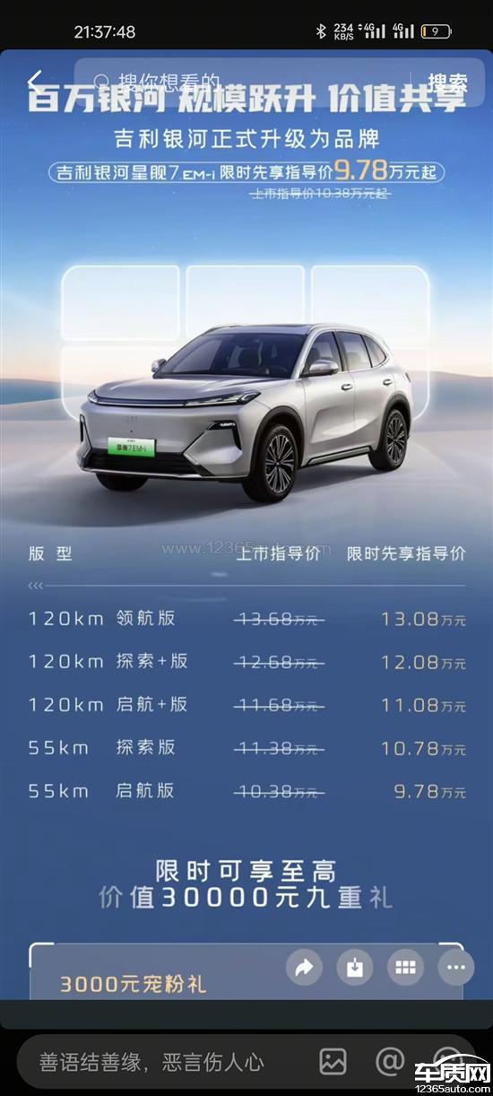 吉利汽车厂家回复:您的信息我们已经收到,感谢您对吉利银河星舰7EM-i的信任与支持。3月3日吉利银河正式升级为品牌,聚焦“百万银河规模跃升价值共享“,特别推出全系限时先享指导价活动以回馈更多的用户,旨在让更多的用户能够享受到吉利银河星舰7EM-i带来的高品质出行之旅。再次感谢您对吉利银河星舰7EM-i的持续关注与信赖!如有疑问欢迎您致电吉利汽车客户服务热线:400-886-9888。