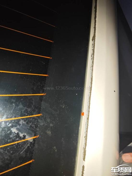 后挡风玻璃两侧排水槽出现大面积掉漆并伴有生锈现象,后挡风玻璃两侧明显车漆剥落,车漆厚度没有车身厚,约为车身车漆一半,厂家在喷漆工艺方面存在问题。