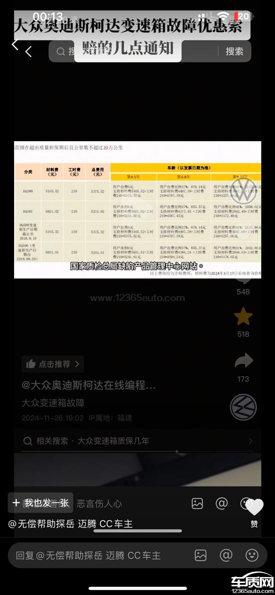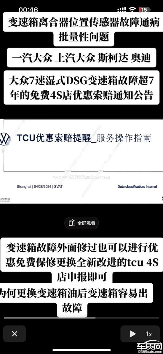 19年6月购买的国五330豪华迈腾,在下班回家途中突然报错“变速箱处于紧急运行模式”,网上查询相关案例,属于大众DQ380变速器的通病,且一汽大众内部有针对此问题的优惠索赔政策,不少车主已经维权成功,大概就是厂家免费出材料,用户自费百分比的费用进行维修更换,但此次我的车发生同样问题到了4S店,4S表示我这个是阀体问题,不属于索赔范围,给我消除了故障码,让我继续使用。车子平时都是一年或者一万公里左右就正常保养。此次通报出问题的是整个TCU总成,阀体,机电单元,传感器等都属于TCU总成,为何我的问题不属于索赔范围呢,诉求是免费更换TCU总成,因为车子才6年不到,五万多公里,后续如果超过8年,就无法进行维权,且本身质量有问题的部件,应该免费予以更换。