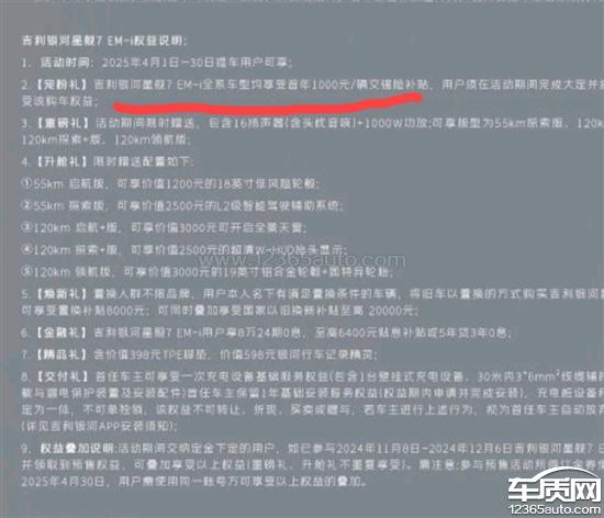 本人于2025年3月31晚间通过吉利银河公众号,了解到2025年4月1日-4月30日期间大定并完成提车银河星舰七,可以享受1000元交强险宠粉礼。(详情如图)本人在指定时间内完成提车,并未享受这一优惠政策。初次到店时有提问相关活动,被4S店告知无该活动。后拨打吉利银河官方客户电话,亦被含糊其辞推托以主页海报为准,详情页仅供参考,客服体验很差,荒唐可笑。