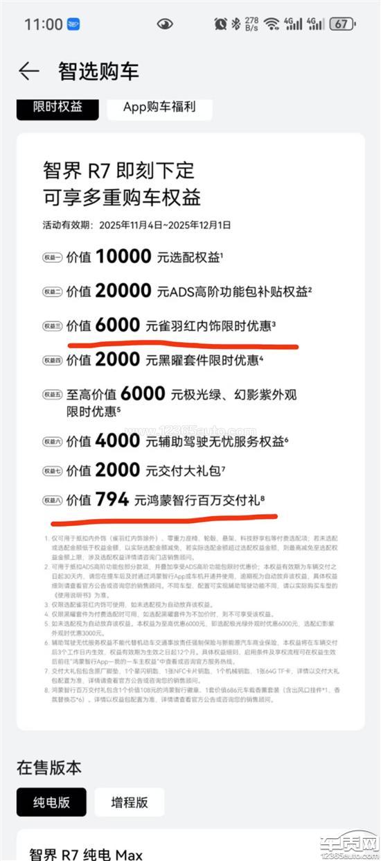 本人于11月3号中午提车智界汽车R7,选配红色内饰花费6000元,厂家于11月4号对红色内饰免费,还额外赠送794元的交付礼包,在未告知消费者的情况下,不足24小时内进行了大额的价格调整,造成消费者较大的损失,侵犯了消费者应有的权益,也对消费者造成了伤害,望厂家能弥补差价造成相应损失。
