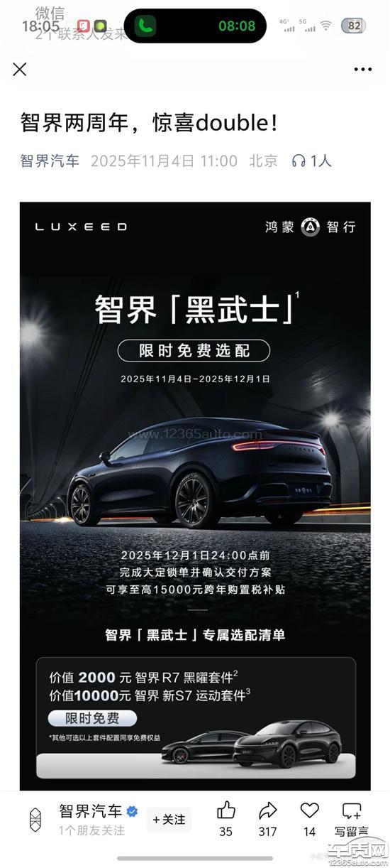 我于2025年9月6日购买新款智界r7,选装了黑耀套件与雀羽红内饰共8000元。11月4日智界官方宣布以上两个配置免费送,我提车不到一周连牌都没来得及上就告诉我亏损8000,试问此事谁能接受,事后联系过鸿蒙智行客服并未得到解决并且没有任何补偿,我作为消费者感到权益实实在在收到侵害,认为该车企售后实在无服务可言且毫无信誉。需车质网解决,我的诉求是退还8000元选装差价或其他补偿权益。