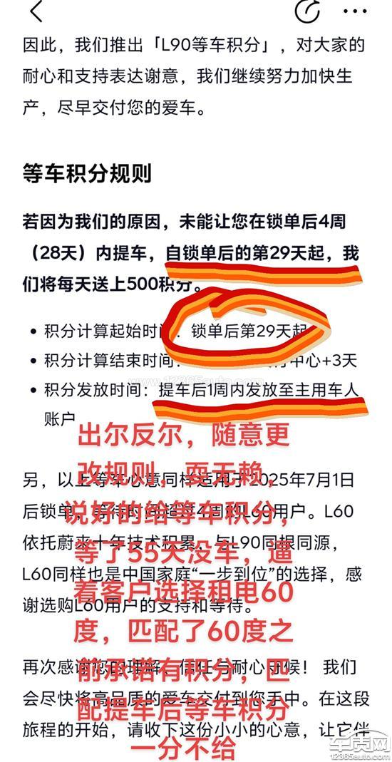 本人于2025年7月20多小订蔚来乐道L90汽车一辆,8月3号大定锁单,订单显示4到6周提车,结果严重违约未按照规定时间交付车辆,该公司推出活动凡是等车时间超过28天,从29天开始每天给500积分给用户,迟迟不交付车辆,等了55天仍然没有生产交付,厂家严重违约,不按顺序交付,只有改60度的电池才能排产,买断必须改租电,当时销售给我匹配了同配置60度电池,告诉我这不是改配置还有等车积分,但是直到今天为止,提车已经半个月仍然没有收到,一问才知道没有等车积分了,当初公布的规则里,清楚写着只要等车超过28天每天都有,现在有出尔反尔,随意更改规则,欺诈消费者,要求退车,把我的85度电池还给我。
