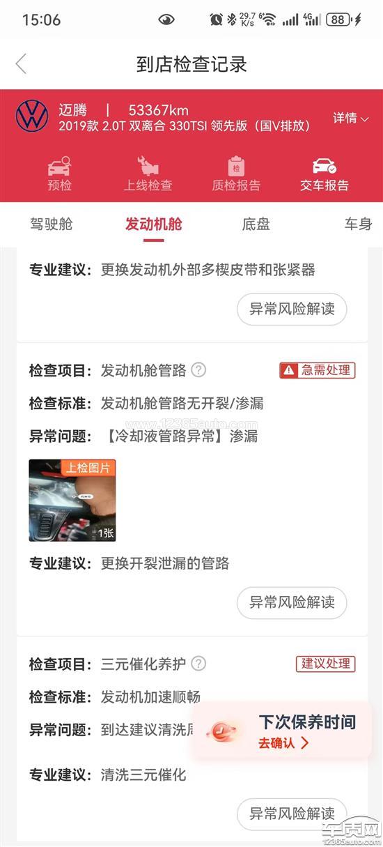 2018年12月购买的19款330领先版迈腾,至今行驶53367公里,无事故。2025年11月28日保养时发现水泵漏液。车主认为,发动机冷却液水泵为汽车核心部件车,在仅使用不到7年6万公里的情况下,如此质核心部件发生问题,对消费者人身安全产生严网重影响,严重损害消费者权益;明显属于产品质量问题、设计缺陷(存在类似问题的迈腾车较多,严重设计、质量缺陷),存在严重安全隐患,根据国家市场监督管理总局相关规定,厂家应采取切实有效的措施消除汽车存在安全隐患,免费给车主解决车辆存在的质量、安全问题。