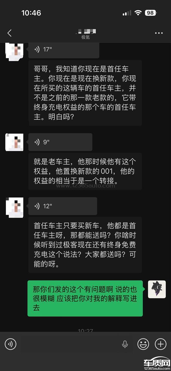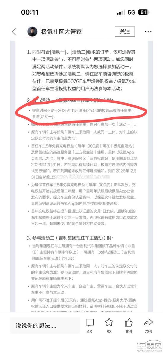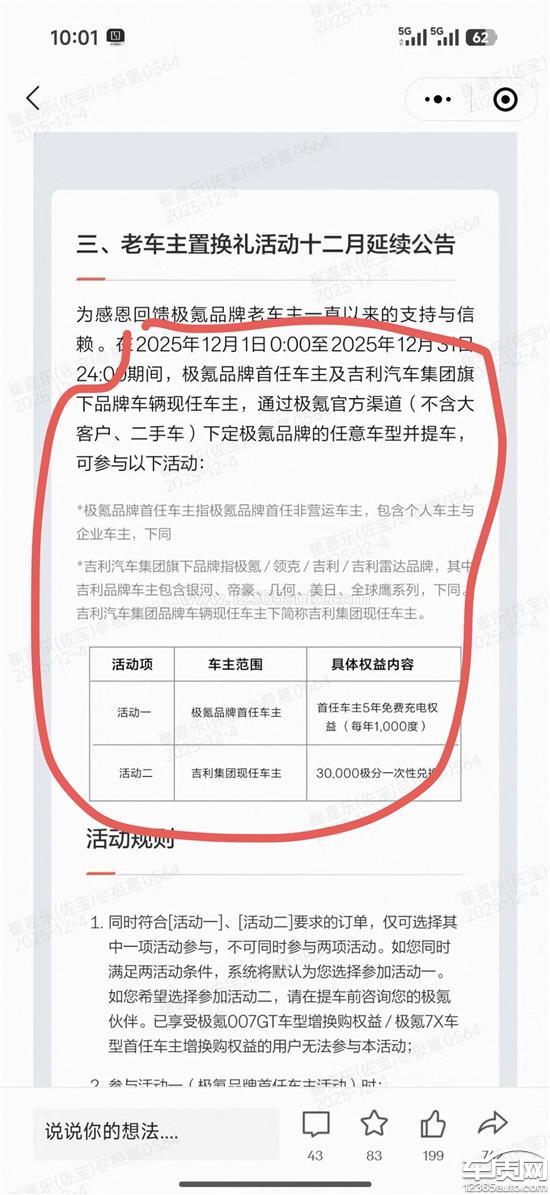 极氪于12月初公布了一个“老车主”充电权益。文中仅描述首任极氪车主可享有5年每年1000度电的充电权益。我于10月12日下定极氪001极氪原计划在7周内(11月30日前)交付,后因极氪自身产能原因需延期交付。在政策出台后,我第一时间询问极氪客服,极氪客服却表示政策仅适用于22款车主!所以我认为该政策适用范围极为模糊,文中关键部分仅标注首任极氪车主,可以淡化是早期版本的极氪,且没有明确写明适用于哪几款车!诱导性极强!希望平台敦促极氪要么贯彻文中所写,对所有政策出台前购买极氪的“老车主”,“首任车主”平等的实施政策。要么立即整改政策描述,明确权益适用范围!不要再让更多的消费者踏入消费陷阱!