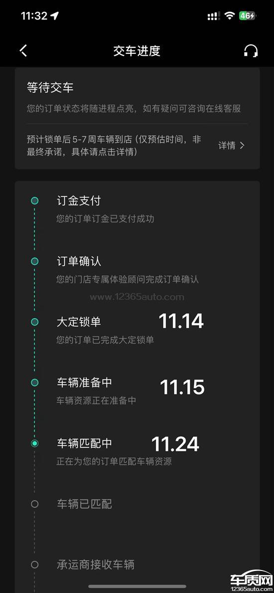 承诺的交车时间5到8周没有兑现,大定两个月还在生产阶段,后台app进度卡在生产阶段一个半月没有进展,现在即将满第8周进入第9周,询问领克平台客服、经销商和领克400无果。