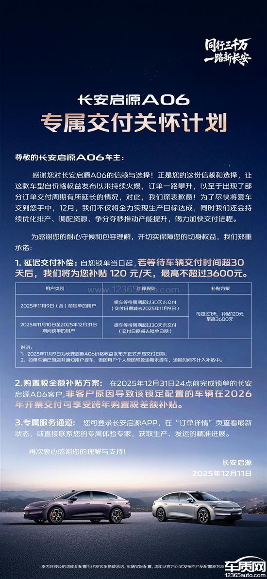 我于2025年11月30日锁单购买了长安启源A06 510 Pro版本。因厂家原因导致无法按时交付,致使我若改购其他车型需额外承担购置税费用。此外,厂家发布的 “买车周期超一个月可享受延迟交付补贴” 政策,商家也拒绝履行赔偿。